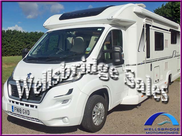No Link Available. A 4 berth RHD 6 Speed Manual 2.3TD Coach-built Motorhome (2018) with PAS, cruise control, 4.5m awning, Tv aerial, solar panel, remote central locking. Colour: Grey/White. Cab air-con, swivel seats, airbags, over-cabin storage, cabin blinds, electric windows & mirrors, radio/CD/media player. Central lounge/dining area with 2 small side facing sofas & removable table, a small round utility table. The kitchen has a fully fitted gas cooker (1 elec & 3 gas hobs), microwave oven, fridge/freezer, sink & drainer, cabinets. Rear washroom with a sink, wc, cabinets & mirror. Separate shower cubicle. End/rear bedroom with a fixed double island bed and 2 wardrobes. Curtains, screens & blinds, large curved roof-light over the dinette, large roof-light, carpet & lino, ample storage, door fly screen. Ceiling fan, Truma heating, spot & strip lighting, 240/12V & leisure battery, Tv point, over-cabin fold-away Tv, electric doorstep. Manuals Pack with some Service History. E&OE.